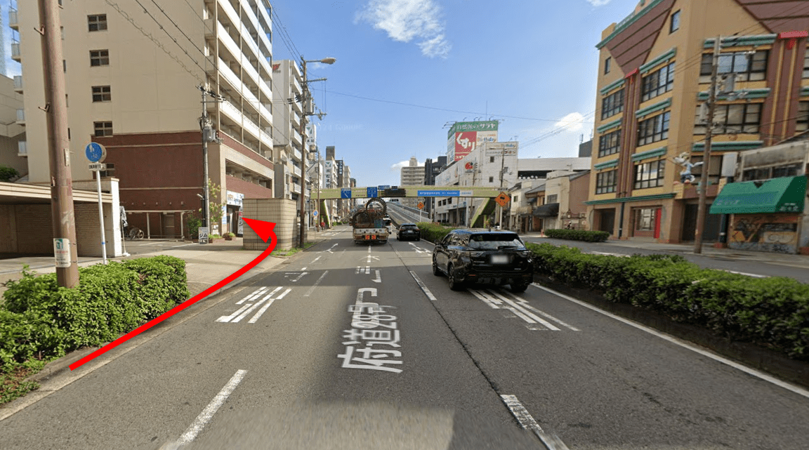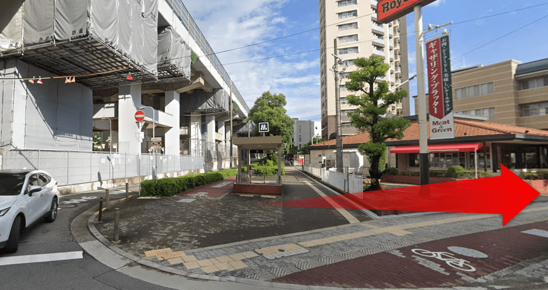 地下鉄文の里駅2番出口から地上に出たところです。ロイヤルホストがある方向に歩道をまっすぐ進みます。