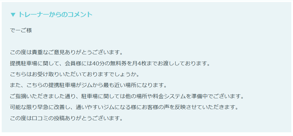 可能な限り早急に改善し、通いやすいジムになる様にお客様の声を反映させていただきます。
